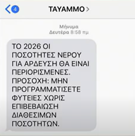 Μήνυμα για τις ποσότητες νερού πήραν οι γεωργοί στα κινητά τους τηλέφωνα ώστε να είναι ιδιαίτερα προσεκτικοί και να λάβουν υπόψη την διαθεσιμότητα του νερού για σκοπούς άρδευσης λόγω των μειωμένων ποσοτήτων νερού στα φράγματα.