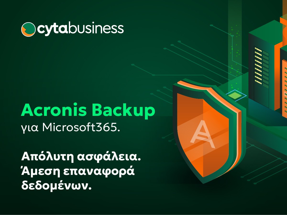 Η Cyta Business δίνει τη λύση με το Acronis Backup για Microsoft365: μια ολοκληρωμένη υπηρεσία που προστατεύει τα κρίσιμα εταιρικά δεδομένα και εξασφαλίζει γρήγορη και ευέλικτη ανάκτηση, όποτε χρειαστεί.