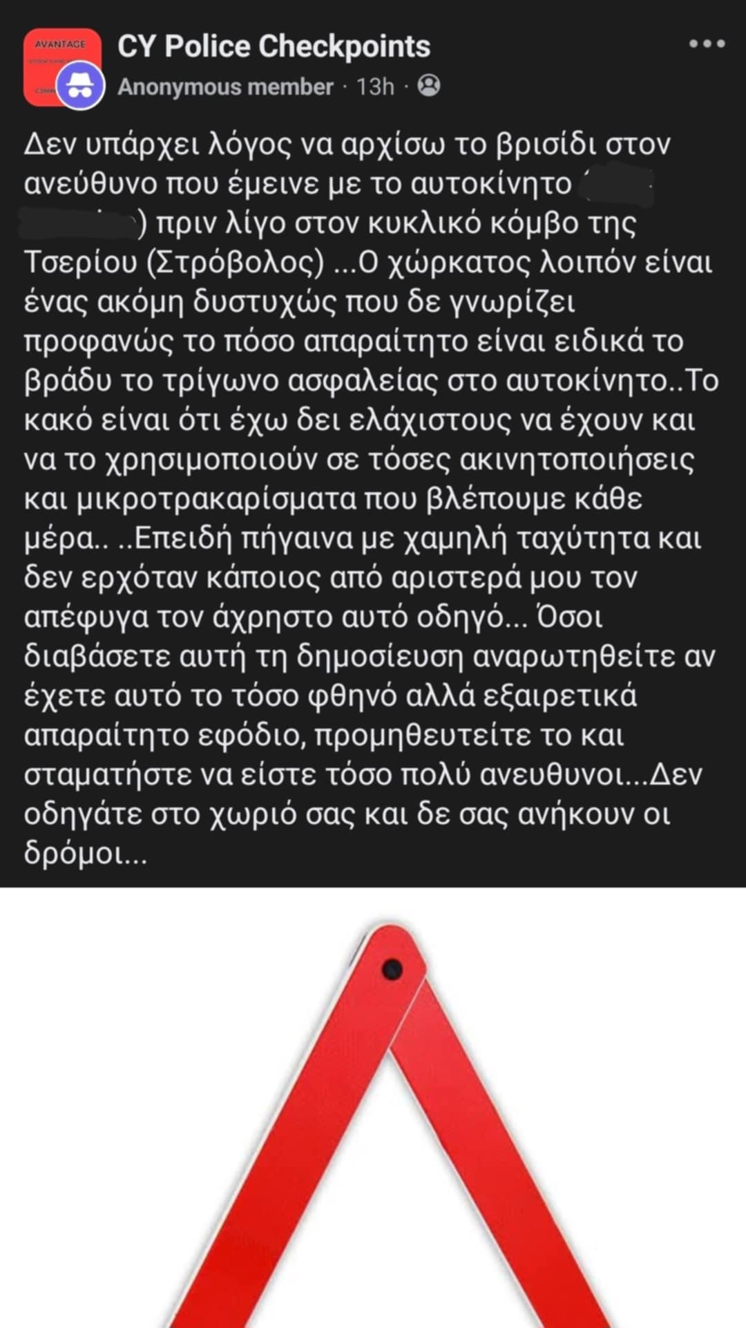 Σύμφωνα με την ανάρτηση, οδηγός οχήματος ακινητοποιήθηκε στη μέση του δρόμου χωρίς να τοποθετήσει τρίγωνο ασφαλείας, θέτοντας σε κίνδυνο τους υπόλοιπους διερχόμενους οδηγούς.