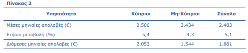 Οι διάμεσες ακαθάριστες μηνιαίες απολαβές για τους Κύπριους υπαλλήλους ήταν €2.053 και για τους μη Κύπριους υπαλλήλους ήταν €1.544.