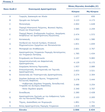 Οι μέσες ακαθάριστες μηνιαίες απολαβές κατά κλάδο οικονομικής δραστηριότητας και υπηκοότητα παρουσιάζονται στον Πίνακα 3. Οι μέσες ακαθάριστες μηνιαίες απολαβές των Κύπριων κατά κλάδο οικονομικής δραστηριότητας για το 2024, κυμαίνονται μεταξύ €1.677 στον τομέα της Γεωργίας, Δασοκομίας και Αλιείας και €4.129 στον τομέα των Χρηματοπιστωτικών και Ασφαλιστικών Δραστηριοτήτων. Οι μέσες ακαθάριστες μηνιαίες απολαβές των μη-Κύπριων κυμαίνονται μεταξύ €650 στον τομέα της Γεωργίας, Δασοκομίας και Αλιείας και €6.172 στον τομέα των Χρηματοπιστωτικών και Ασφαλιστικών Δραστηριοτήτων.