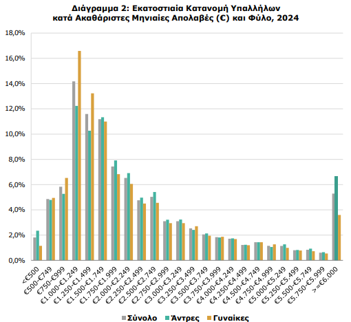 Στο διάγραμμα 2, δίνεται η εκατοστιαία κατανομή των υπαλλήλων κατά ομάδα ακαθάριστων μηνιαίων απολαβών και φύλο. Το υψηλότερο ποσοστό υπαλλήλων (14,2%) αντιστοιχεί στην ομάδα υπαλλήλων που λαμβάνουν μεταξύ €1.000 και €1.249. Ακολουθούν οι ομάδες των υπαλλήλων που λαμβάνουν μεταξύ €1.250 και €1.499 (11,6%) και αυτών που λαμβάνουν μεταξύ €1.500 και €1.749 (11,2%).