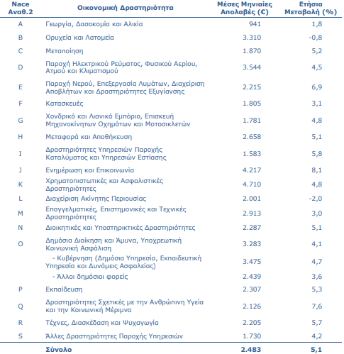 Οι μέσες ακαθάριστες μηνιαίες απολαβές κατά κλάδο οικονομικής δραστηριότητας, για το 2024, κυμαίνονται μεταξύ €941 στον τομέα της Γεωργίας, Δασοκομίας και Αλιείας και €4.710 στον τομέα των Χρηματοπιστωτικών και Ασφαλιστικών Δραστηριοτήτων.