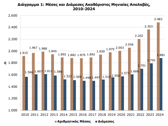 Σημειώνεται ότι, για το 2023, η αντίστοιχη αύξηση ήταν 7,3%. Οι διάμεσες ακαθάριστες μηνιαίες απολαβές των υπαλλήλων κατά το 2024 ήταν €1.881.