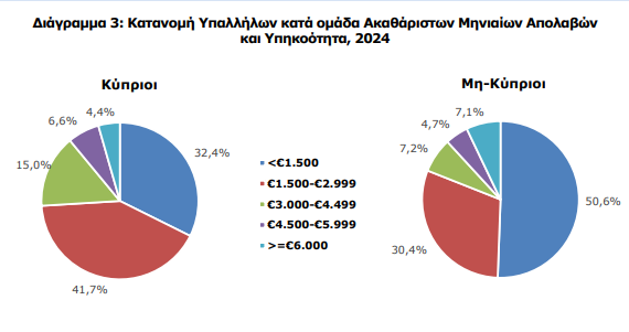 Στο διάγραμμα 3, δίνεται η εκατοστιαία κατανομή των υπαλλήλων κατά ομάδα ακαθάριστων μηνιαίων απολαβών και υπηκοότητα. Οι μη-Κύπριοι υπάλληλοι συγκεντρώνουν μεγαλύτερα ποσοστά υπαλλήλων, σε σχέση με τους Κύπριους, στις ομάδες με τις χαμηλότερες (<€1.500) και τις ψηλότερες (>=€6.000) απολαβές.