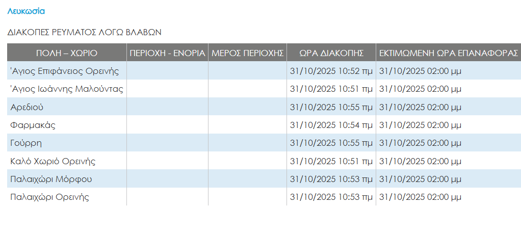 Συγκεκριμένα, η βλάβη επηρεάζει τις εξλης περιοχές: Άγιο Επιφάνειο Ορεινής, Άγιο Ιωάννη Μαλούντας, Αρεδιού, Καλό Χωριό Ορεινής, Παλαιχώρι Μόρφου, Παλαιχώρι Ορεινής.