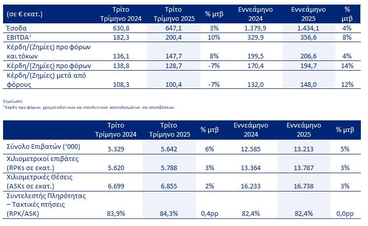 Ο ενοποιημένος Κύκλος Εργασιών για το εννεάμηνο του 2025 ανήλθε σε €1,43 δισ., αυξημένος κατά 4% σε σχέση με το αντίστοιχο διάστημα του 2024. Ο Όμιλος προσέφερε 16,0 εκατ. θέσεις και μετέφερε 13,2 εκατ. επιβάτες, 5% περισσότερους σε σχέση με την περσινή περίοδο, εκ των οποίων 7,7 εκατ. επιβάτες από/προς προορισμούς του εξωτερικού και 5,5 εκατ. επιβάτες στο δίκτυο εσωτερικού.