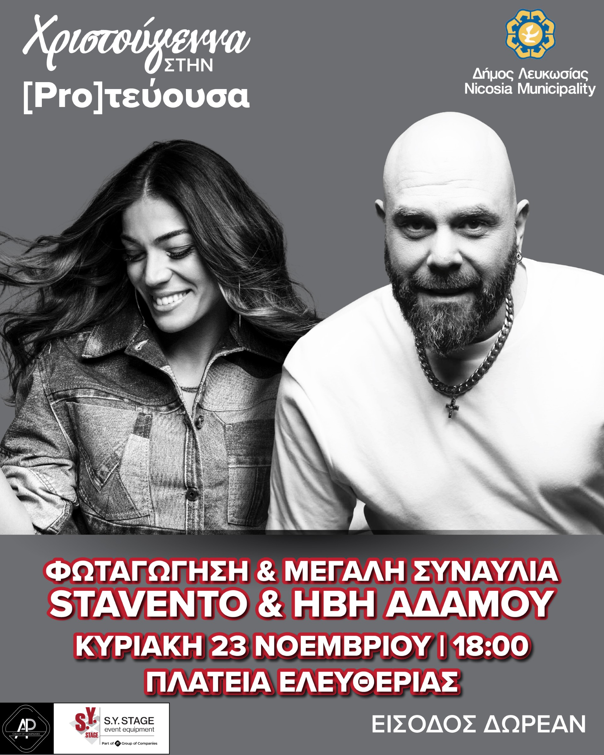 Η επίσημη έναρξη των Εκδηλώσεων του Δήμου Λευκωσίας για τα φετινά Χριστούγεννα θα πραγματοποιηθεί την Κυριακή 23 Νοεμβρίου με 2 παρελάσεις, τη φωταγώγηση του Χριστουγεννιάτικου δέντρου στην Πλατεία Ελευθερίας και θα κορυφωθεί με μία μεγάλη συναυλία, ανοικτή για το κοινό με τους Stavento & Ήβη Αδάμου.