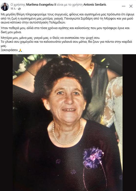 Σε βαρύ πένθος βρίσκεται η Υφυπουργός Πρόνοιας Μαριλένα Ευαγγέλου, μετά τον θάνατο της αγαπημένης της πεθεράς, Παναγιώτας Σερδάρη, από τη Μόρφου, η οποία έφυγε από τη ζωή. Η εκλιπούσα υπήρξε για μισό αιώνα κάτοικος στην αυτοστεγία Πολεμιδιών και ήταν ιδιαίτερα αγαπητή σε όσους τη γνώριζαν.
