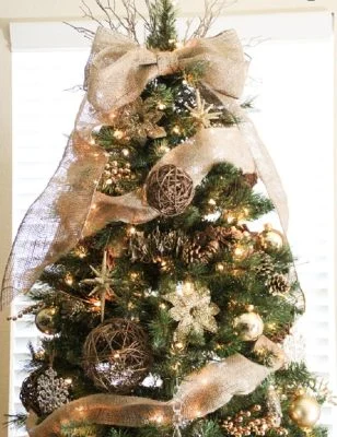 Ένας μεγάλος, διακοσμητικός φιόγκος από κορδέλα μπορεί να είναι μια απλή και κομψή επιλογή. Εναλλακτικά, αν έχεις μια πιο boho ρουστίκ χριστουγεννιάτικη διακόσμηση μπορείς να συνδυάσεις χριστουγεννιάτικες κορδέλες με κορδέλα λινάτσας δημιουργώντας μια πρωτότυπη σύνθεση στη κορυφή του δέντρου σου.