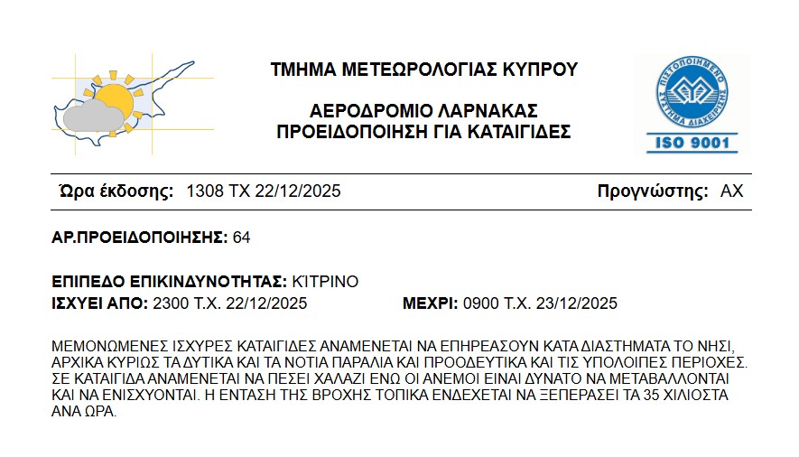 Νέα κίτρινη προειδοποίηση εξέδωσε το Τμήμα Μετεωρολογίας. Η προειδοποίηση θα τεθεί σε ισχύ στις 11 το βράδυ της Δευτέρας 22/12 μέχρι τις 09 το πρωί της Τρίτης 23/12