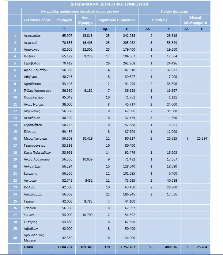 Όπως θα δείτε πιο κάτω το συνολικό ποσό που λαμβάνουν οι Δήμαρχοι αγγίζει το 1,6 εκ. ευρώ ενώ για τους 370 δημοτικούς συμβούλους το ποσό ξεπερνά τα 2,5 εκατομμύρια ευρώ!