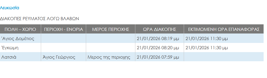Πρόκειται για βλάβης μέσης τάσης στο δίκτυο της ΑΗΚ, με την εκτιμώμενη ώρα επαναφοράς είναι γύρω στις 23:30.