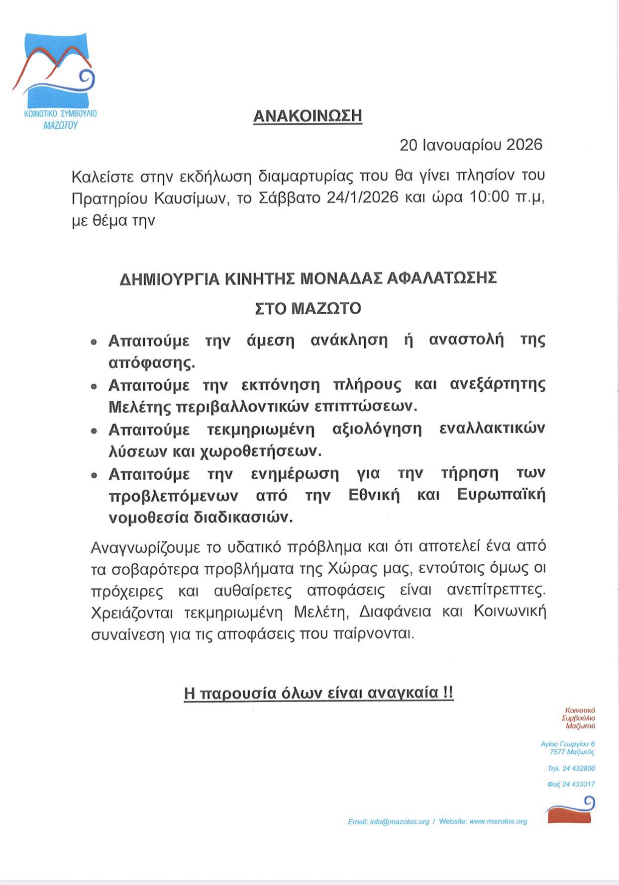 Το Κοινοτικό Συμβούλιο Μαζωτού, διοργανώνει αύριο Σάββατο 24 Ιανουαρίου, 2026, στις 10π.μ., εκδήλωση διαμαρτυρίας, σε ανοιχτό χώρο στον κεντρικό δρόμο Μαζωτού – Κιτίου.