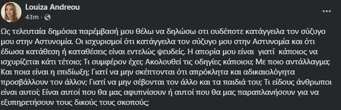«Ουδέποτε κατάγγειλα τον σύζυγο μου στην Αστυνομία» ξεκαθαρίζει η ίδια σε ανάρτησή της στον προσωπικό της λογαριασμό σε μέσο κοινωνικής δικτύωσης
