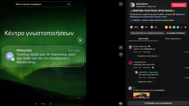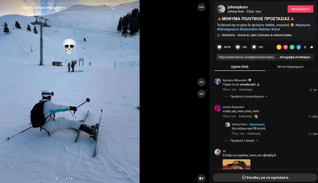 Συγκεκριμένα όταν ένας σκιέρ ανέβασε στο προφίλ του στο TikTok δύο φωτογραφίες του από το χιονοδρομικό κέντρο και ένα screenshot από μήνυμα του πατέρα του που τον παρακαλούσε να προσέχει λόγω της παρουσίας Μητσοτάκη στα Καλάβρυτα, δεν περίμενε ότι θα δει απάντηση από τον ίδιο τον Πρωθυπουργό.