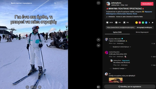 «Για ένα σκι ήρθα, τι μπορεί να πάει στραβά;», αναρωτήθηκε αρχικά ο σκιέρ με όνομα χρήστη στο TikTok «johnnykoro» και στη συνέχεια μας παρουσίασε την προειδοποίηση του πατέρα: «Πρόσεχε αγόρι μου σε παρακαλώ γιατί έχει έρθει για σκι στα Καλάβρυτα ο Μητσοτάκης».