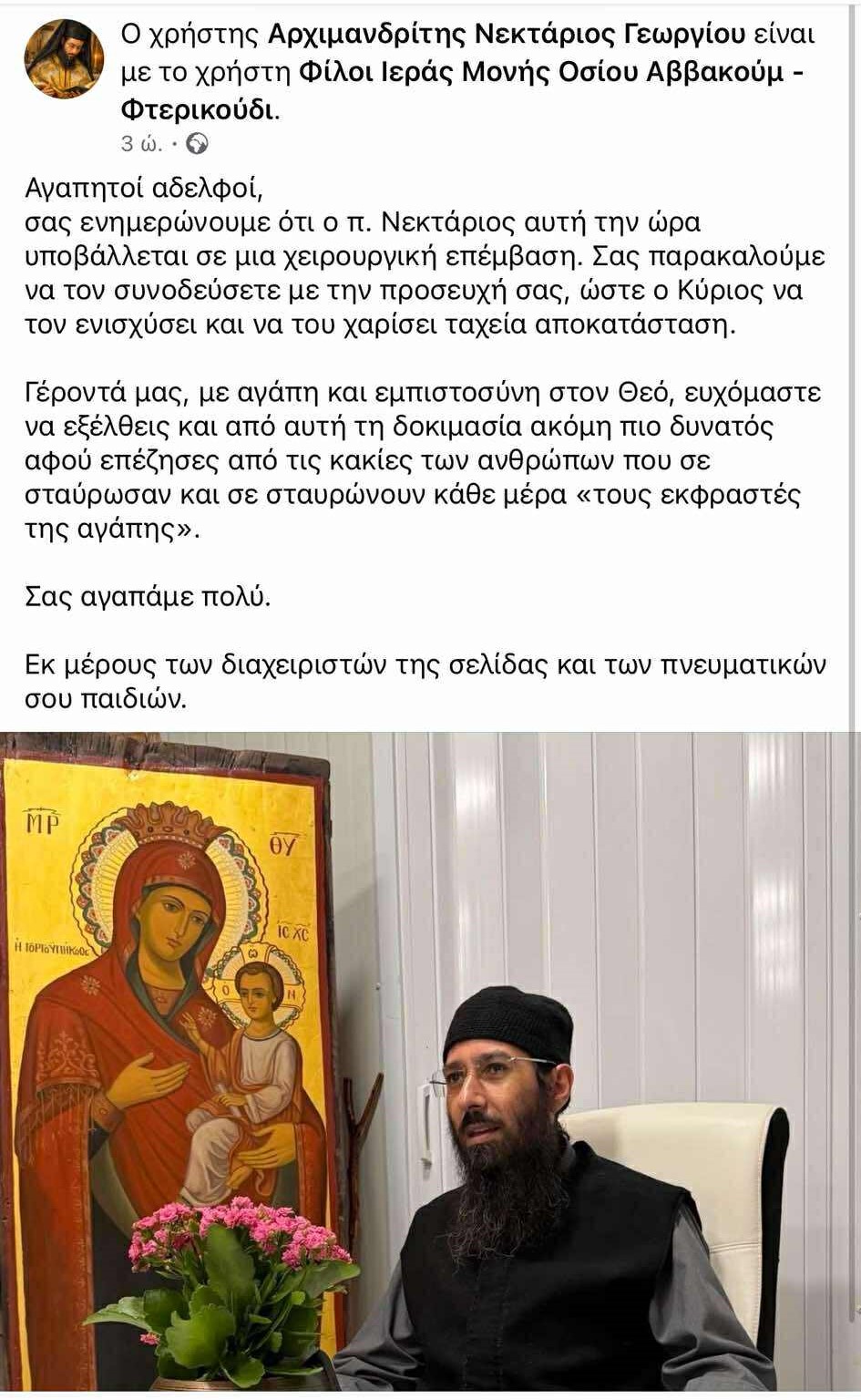 Σε χειρουργική επέμβαση υποβλήθηκε το πρωί της Τετάρτης ο μοναχός, τέως αρχιμανδρίτης, Νεκτάριος, όπως έγινε γνωστό στη σελίδα με το όνομά του και την ομάδα Φίλοι Ιεράς Μονής Οσίου Αββακούμ-Φτερικούδι.