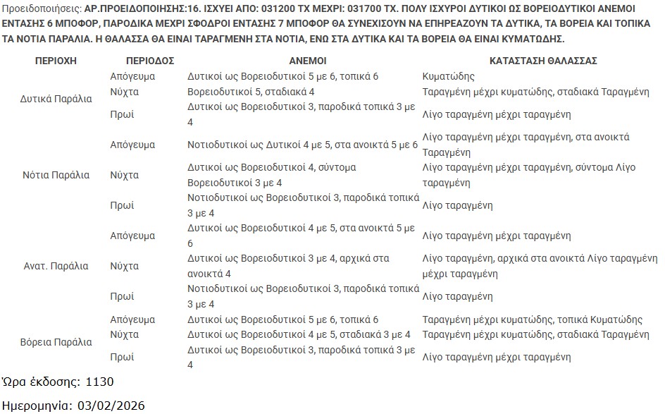 Ανακοίνωση αναφέρει ότι ισχυροί, μέχρι πολύ ισχυροί και παροδικά πολύ ισχυροί μέχρι σφοδροί δυτικοί έως βορειοδυτικοί άνεμοι, έντασης 5 με 6 μποφόρ και παροδικά 6 με 7 μποφόρ, θα επηρεάσουν τα δυτικά και τοπικά τα νότια και βόρεια παράλια.