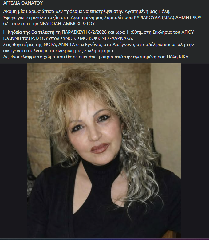 Η Κηδεία της θα τελεστή τη ΠΑΡΑΣΚΕΥΗ 6/2/2026 και ωρα 11:00πμ στη Εκκλησία του ΑΓΙΟΥ ΙΩΑΝΝΗ του ΡΩΣΣΟΥ στον ΣΥΝΟΙΚΙΣΜΟ ΚΟΚΚΙΝΕΣ-ΛΑΡΝΑΚΑ.