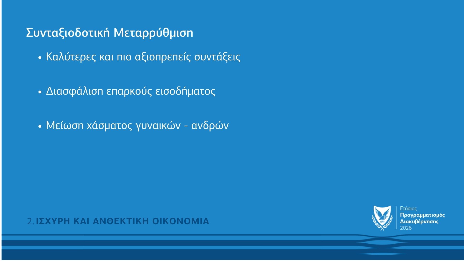 Το 2026 η κυβέρνηση προχωρά με μία άλλη εμβληματική Μεταρρύθμιση που αφορά το Συνταξιοδοτικό σύστημα της χώρας μας. «Kαταθέτουμε το νομοσχέδιο για καλύτερες και πιο αξιοπρεπείς συντάξεις, με τρόπο απλό, ουσιαστικό και βιώσιμο, ώστε Να ενισχύσουμε τους συνταξιούχους μας, Να διασφαλίσουμε επαρκές εισόδημα, Να περιορίσουμε το χάσμα μεταξύ γυναικών και ανδρών», είπε.