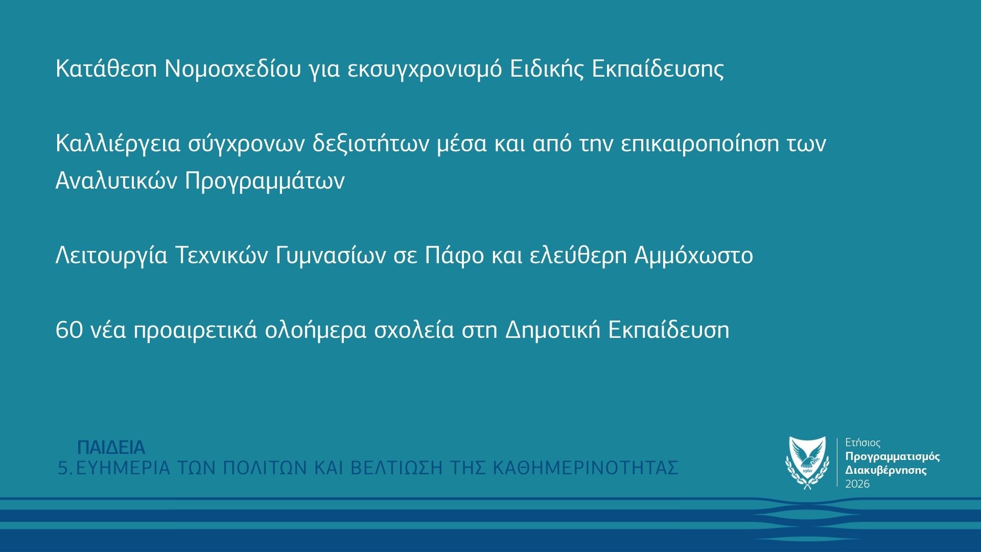 • Συνεχίζεται η αναβάθμιση της Τεχνικής και Επαγγελματικής Εκπαίδευσης, με την επέκταση του θεσμού του Τεχνικού Γυμνασίου, πέραν από τη Λευκωσία και Λεμεσό, σε Πάφο και ελεύθερη Αμμόχωστο. Η καινοτομία του Τεχνικού Γυμνασίου, καθώς και η επαναφορά, μετά από 13 χρόνια, της εβδομάδας εργασίας, ενισχύουν τη διασύνδεση της εκπαίδευσης με την αγορά εργασίας.