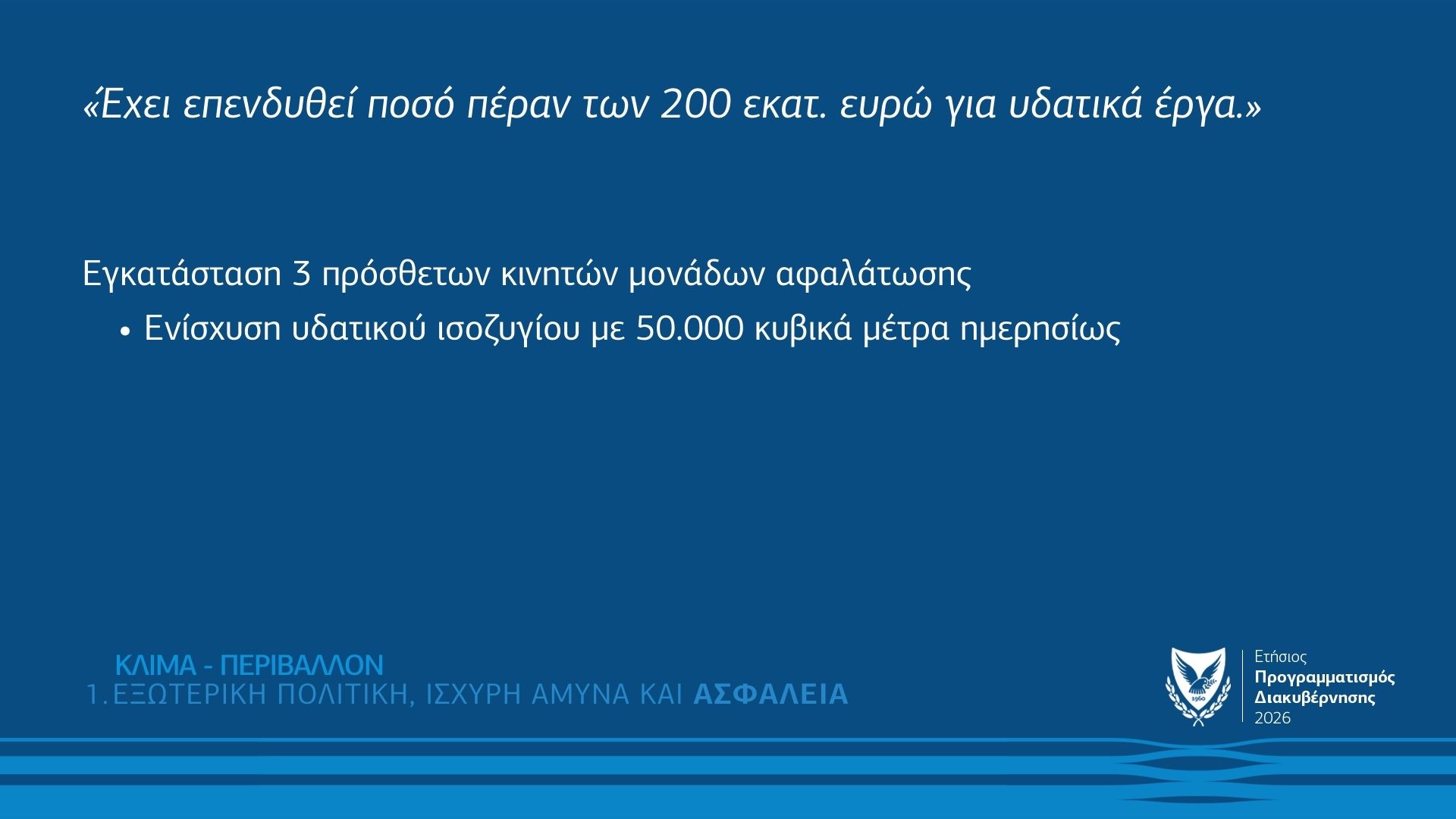Στο πλαίσιο της κυπριακής Προεδρίας της ΕΕ, προωθείται η Στρατηγική για την Ανθεκτικότητα του Νερού, συμβάλλοντας στην προετοιμασία του νέου Ευρωπαϊκού Σχεδίου Προσαρμογής στην Κλιματική Αλλαγή, και στην αντιμετώπιση των αυξανόμενων πιέσεων λόγω της λειψυδρίας. Πιέσεις που αντιμετωπίζει έντονα και η πατρίδα μας, γι’ αυτό και τα τελευταία δύο χρόνια έχει επενδυθεί ποσό πέραν των 200 εκατομμυρίων ευρώ. Το 2026 προχωρούμε στην εγκατάσταση 3 πρόσθετων κινητών μονάδων αφαλάτωσης, ενισχύοντας το υδατικό μας ισοζύγιο με 50.000 κυβικά μέτρα νερού ημερησίως.