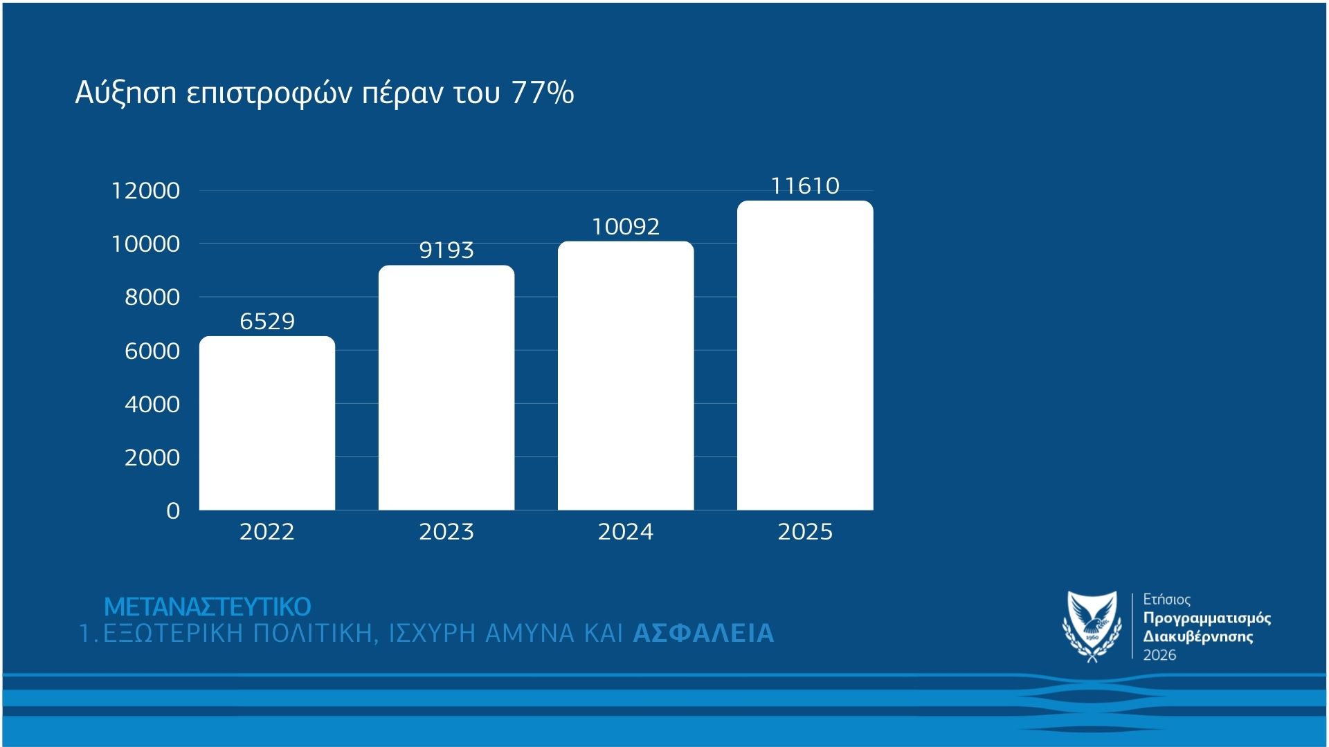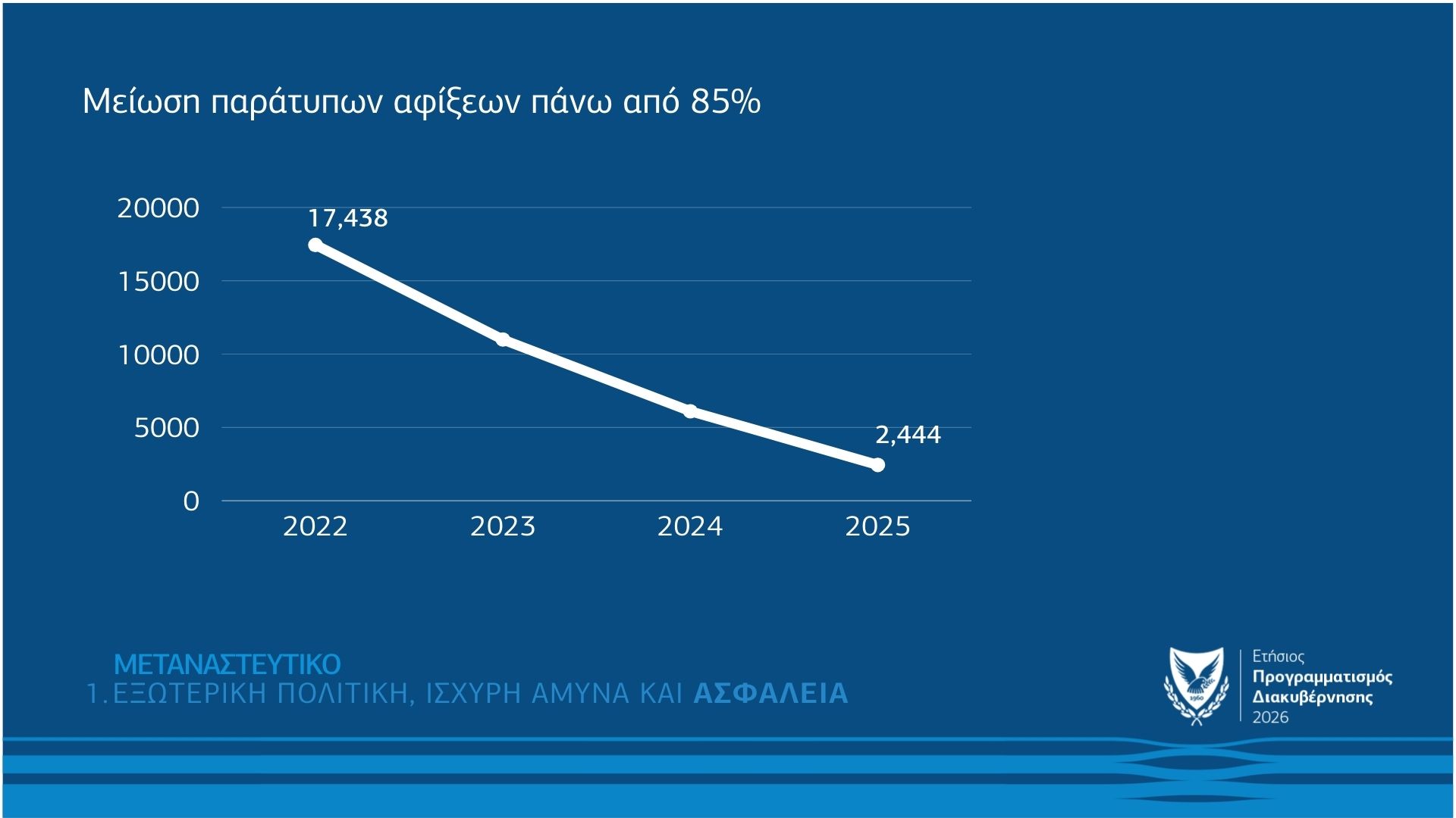 Για το Μεταναστευτικό αφού εξέφρασε ευαρέσκεια για το γεγονός ότι πλέον σαν αποτέλεσμα της ολιστικής προσέγγισης της κυβέρνησης η Κύπρος ΔΕΝ θεωρείται πλέον ελκυστικός προορισμός, αναφέρθηκε στην απόφαση της κυβέρνησης για αφαίρεση του καθεστώτος συμπληρωματικής προστασίας ή της άδειας παραμονής από αλλοδαπούς που διαπράττουν ποινικά αδικήματα, με σκοπό τον άμεσο επαναπατρισμό τους.