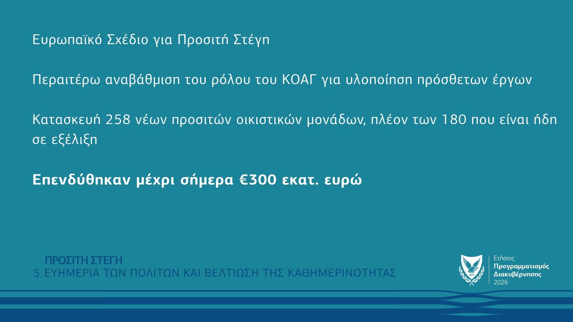 Επίσης, αναβαθμίζεται περαιτέρω ο ρόλος του Κυπριακού Οργανισμού Ανάπτυξης Γης, μέσω κρατικής χρηματοδότησης για υλοποίηση πρόσθετων έργων. Εντός του 2026, ο Οργανισμός προχωρά με την κατασκευή 258 νέων προσιτών οικιστικών μονάδων, πλέον των 180 που είναι ήδη σε εξέλιξη, ενώ, σε συνεργασία με τον ιδιωτικό τομέα, προχωρούμε με την κατασκευή 500 περίπου νέων οικιστικών μονάδων σε κρατική γη, μια επένδυση συνολικής αξίας πέραν των 75 εκατομμυρίων ευρώ.