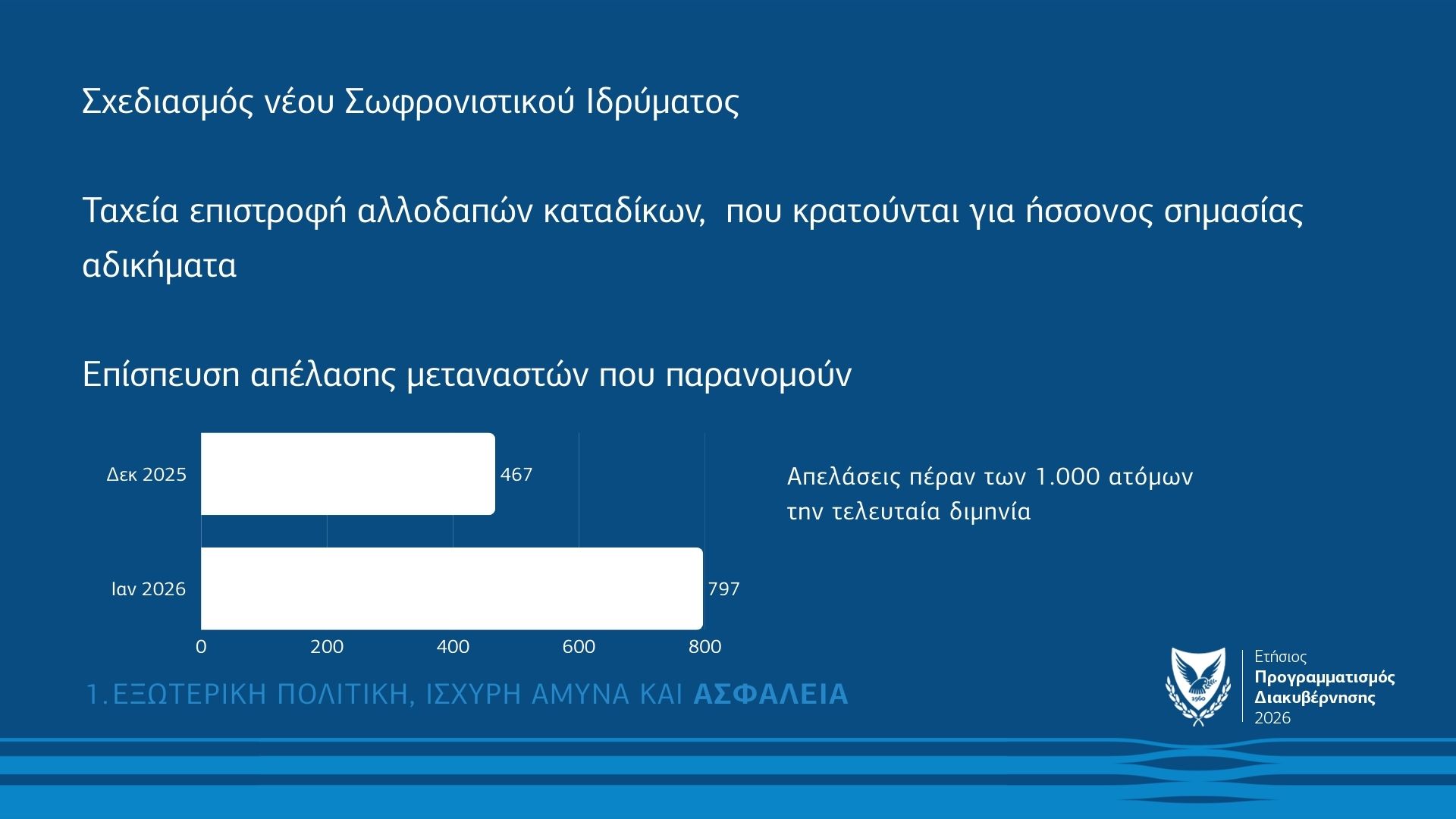 «Η ενίσχυση του αισθήματος Ασφάλειας των πολιτών αποτελεί θεμελιώδη υποχρέωσή μας και αναγνωρίζουμε ότι στον τομέα της Δημόσιας Τάξης πρέπει να γίνουν ακόμα περισσότερα» σημείωσε ο Πρόεδρος και αφού αναφέρθηκε στις ενέργειες για αντιμετώπιση του χρονίζοντος προβλήματος του υπερπληθυσμού των φυλακών, ανακοίνωσε ότι το 2026 προωθείται εκ βάθρων ανασυγκρότηση του σωφρονιστικού συστήματος της χώρας, περιλαμβανομένου και του σχεδιασμού για ανέγερση νέου, σωφρονιστικού ιδρύματος εκτός αστικού ιστού. Επίσης, προωθούνται διαδικασίες ταχείας επιστροφής αλλοδαπών καταδίκων, οι οποίοι κρατούνται για ήσσονος σημασίας αδικήματα, και επισπεύδεται η απέλαση μεταναστών που παρανομούν. Οπως είπε, τη τελευταία διμηνία έχουν απελαθεί πέραν των 1.000 ατόμων.