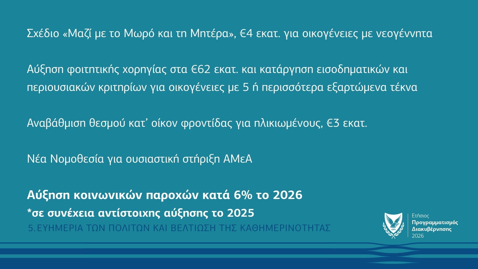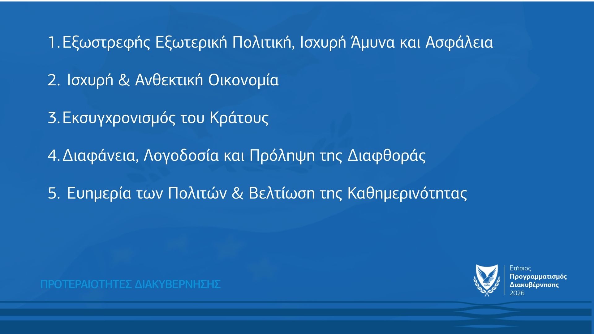 Όπως είπε, όλες οι Πολιτικές που προγραμματίζονται για το 2026 είναι Κοστολογημένες και Υλοποιήσιμες, και βασίζονται στις πέντε προτεραιότητες της Διακυβέρνησης, ως εξής: