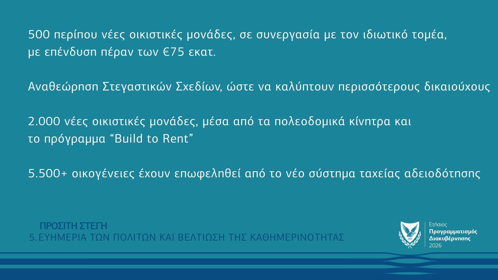 Παράλληλα, εντός του 2026 αναθεωρούνται τα Στεγαστικά Σχέδια ώστε να καλύπτουν περισσότερους δικαιούχους, ενώ μέσα από τα πολεοδομικά κίνητρα και το πρόγραμμα «Build to Rent» αναμένεται να δημιουργηθούν εντός διετίας περίπου 2.000 νέες οικιστικές μονάδες. Ταυτόχρονα, ο εκσυγχρονισμός και η ταχύτητα του νέου συστήματος αδειοδότησης αυξάνουν το οικιστικό απόθεμα αφού ήδη, περισσότερες από 5.500 οικογένειες έχουν επωφεληθεί από τις νέες διαδικασίες.