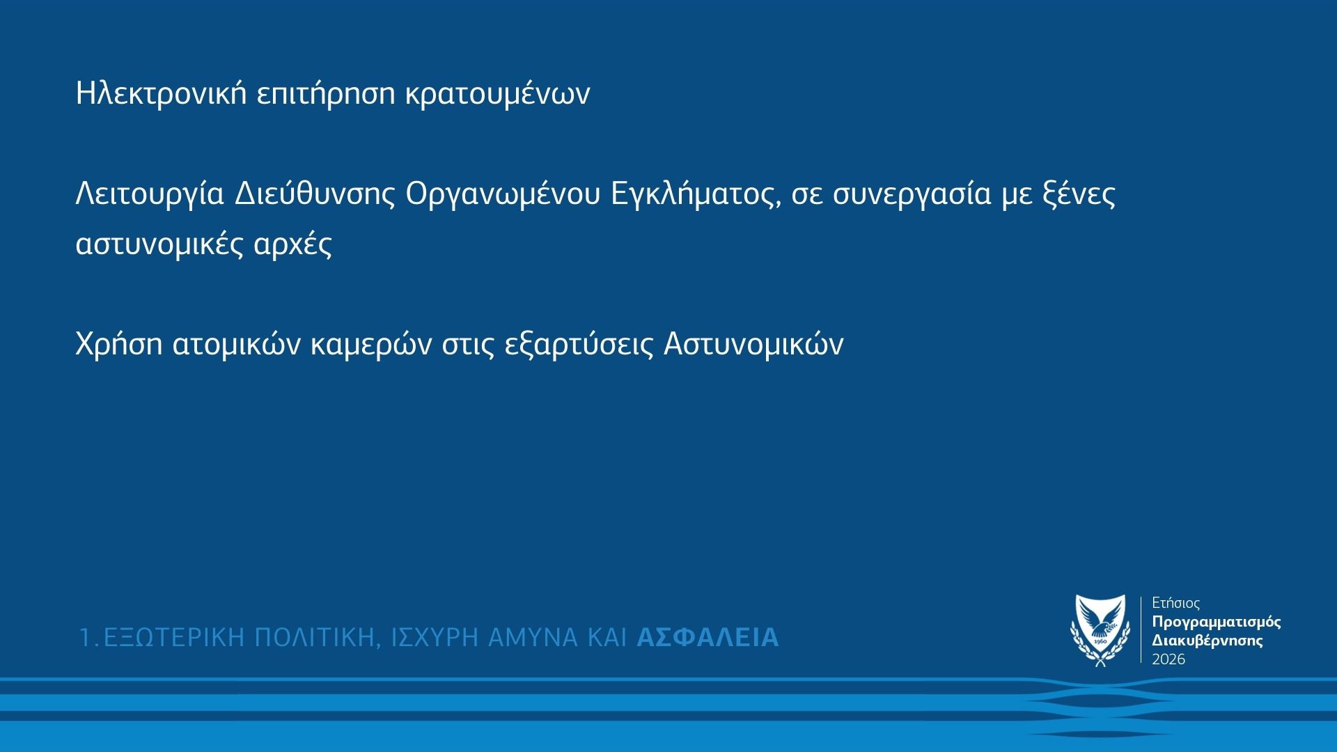 Eνδυναμώνεται ο θεσμός της ηλεκτρονικής επιτήρησης κρατουμένων και σε συνδυασμό με τη Νομοθεσία για την ποινικοποίηση της εισαγωγής, χρήσης και κατοχής κινητών τηλεφώνων, ενισχύεται ουσιαστικά η Ασφάλεια. Το 2026 θα λειτουργήσει επίσης η Διεύθυνση Οργανωμένου Εγκλήματος, με εξειδικευμένες δυνατότητες για την αντιμετώπιση σύγχρονων μορφών εγκληματικότητας, σε συνεργασία με ξένες αστυνομικές αρχές. Για την αντιμετώπιση του οργανωμένου εγκλήματος αναμένεται εντός του μήνα και η ψήφιση από τη Βουλή του νομοσχεδίου για τη χρήση ατομικών καμερών στις εξαρτύσεις των αστυνομικών.