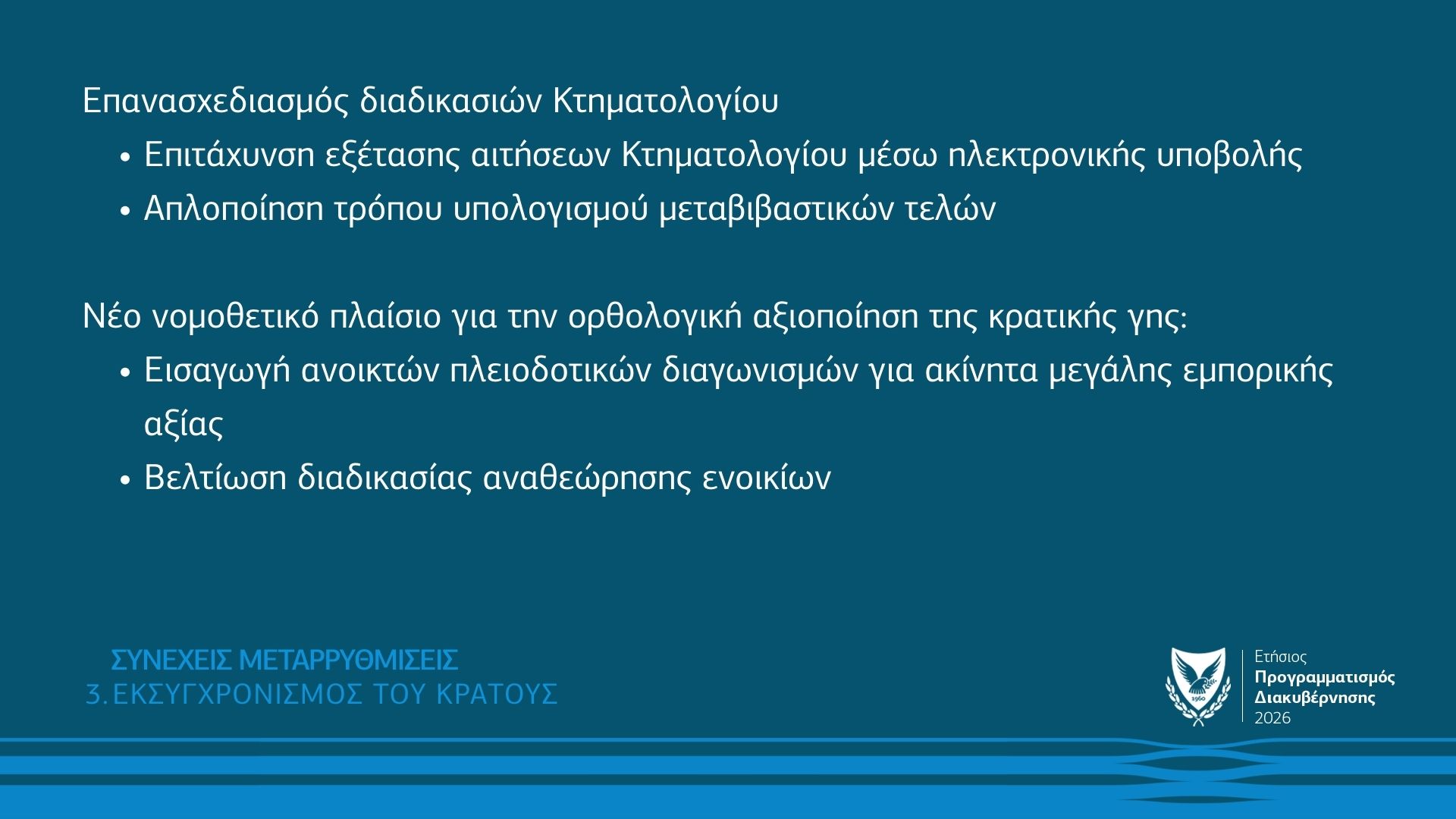 Η ανάγκη για συνεχείς Μεταρρυθμίσεις περιλαμβάνουν φέτος και συνολικό επανασχεδιασμό των διαδικασιών του Κτηματολογίου, επιταχύνοντας την εξέταση αιτήσεων μέσω ηλεκτρονικής υποβολής, και απλοποιώντας τον τρόπο υπολογισμού των μεταβιβαστικών τελών. Ταυτόχρονα, προωθείται νέο νομοθετικό πλαίσιο για την ορθολογική αξιοποίηση της κρατικής γης, στη βάση των αρχών της Διαφάνειας και της Ίσης Μεταχείρισης: Εισάγεται ο θεσμός των ανοικτών πλειοδοτικών διαγωνισμών για ακίνητα μεγάλης εμπορικής αξίας, βελτιώνεται η διαδικασία αναθεώρησης των ενοικίων και διευρύνεται το πεδίο αξιοποίησης της κρατικής γης, για την κάλυψη νέων αναγκών και χρήσεων που εξυπηρετούν το δημόσιο συμφέρον.