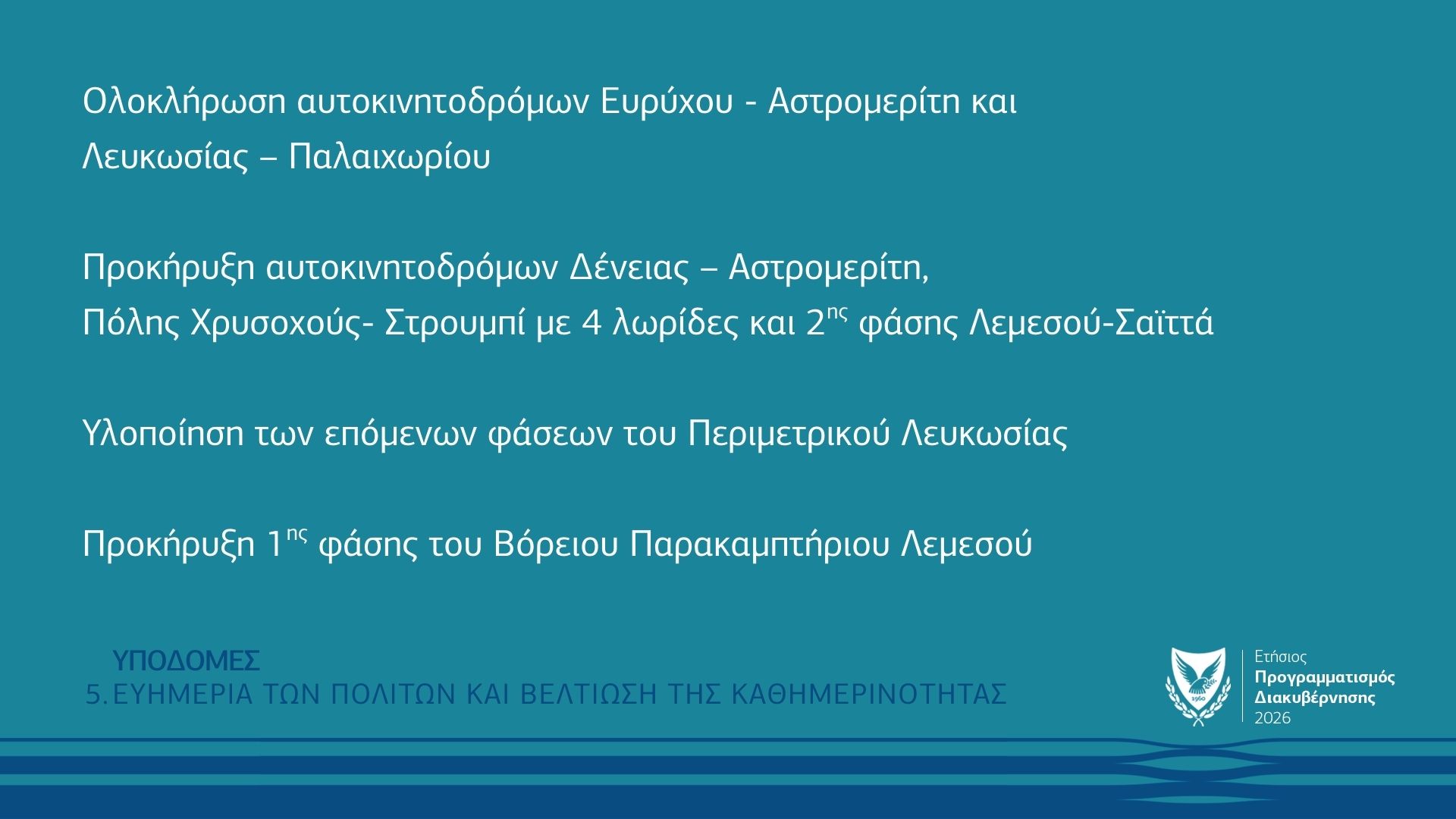 Στον τομέα των Υποδομών, συνεχίζεται η προώθηση μεγάλων οδικών έργων. Το 2026 ολοκληρώνεται η κατασκευή των αυτοκινητοδρόμων από Ευρύχου προς Αστρομερίτη και από Λευκωσία προς Παλαιχώρι. Προκηρύσσονται επίσης οι αυτοκινητόδρομοι Δένειας προς Αστρομερίτη, Πόλης Χρυσοχούς προς Στρουμπί με 4 λωρίδες, και η 2η φάση του αυτοκινητόδρομου Λεμεσού προς Σαιττά. Στα μεγάλα αστικά κέντρα προχωρούν οι εργασίες ολοκλήρωσης του οδικού δικτύου με στόχο την αποσυμφόρηση. Στη Λευκωσία υλοποιούνται οι επόμενες φάσεις του Περιμετρικού και για τη Λεμεσό προκηρύσσεται η 1η φάση του Βόρειου Παρακαμπτήριου.