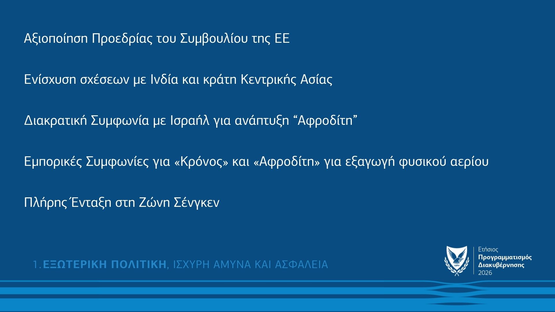 Το 2026 η κυβέρνηση θα συνεχίσει να επενδύει στην περαιτέρω εξωστρέφεια της χώρας και η Κυπριακή Δημοκρατία, αξιοποιώντας τη θεσμική ευκαιρία της Προεδρίας του Συμβουλίου της Ευρωπαϊκής Ένωσης, θα ενισχύσει το αποτύπωμά της στις Βρυξέλλες ενώ παράλληλα θα εμβαθύνει τις σχέσεις της με τις χώρες της περιοχής.