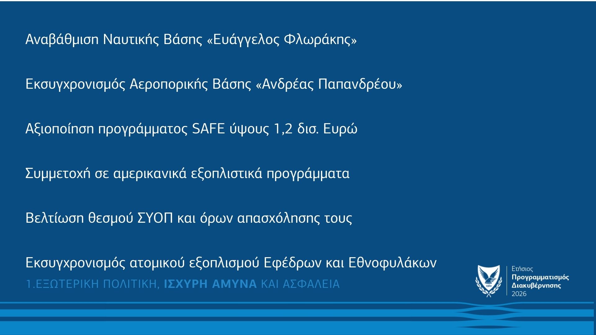Ταυτόχρονα, θα αξιοποιηθεί το ευρωπαϊκό πρόγραμμα SAFE με συνολική χρηματοδότηση ύψους 1.2 δισεκατομμυρίων ευρώ, για απόκτηση σύγχρονου εξοπλισμού, που θα αναβαθμίσει την αμυντική θωράκιση της πατρίδας μας και συνάμα θα στηρίζει την Kυπριακή αμυντική βιομηχανία.