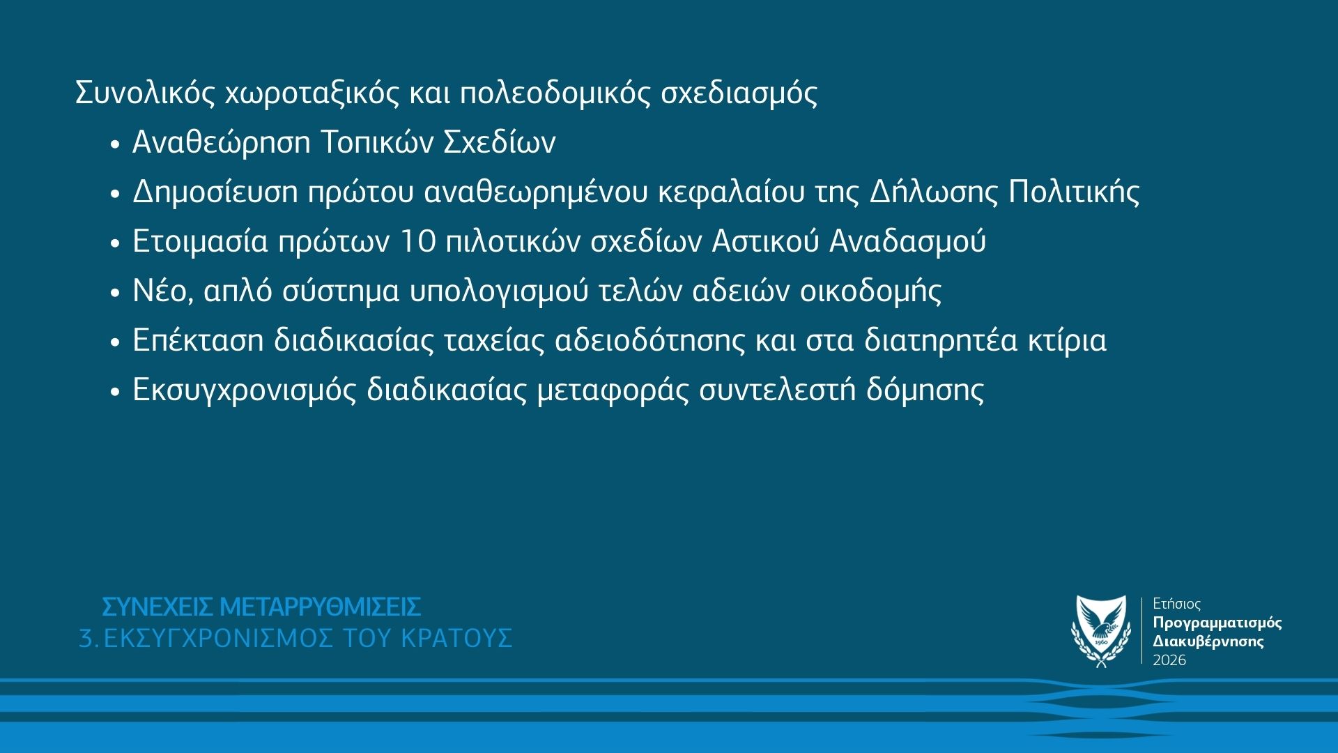Το 2026 εκσυγχρονίζεται επίσης ο πολεοδομικός και χωροταξικός σχεδιασμός της χώρας για να ανταποκρίνεται στις ανάγκες των πολιτών, ως εξής: