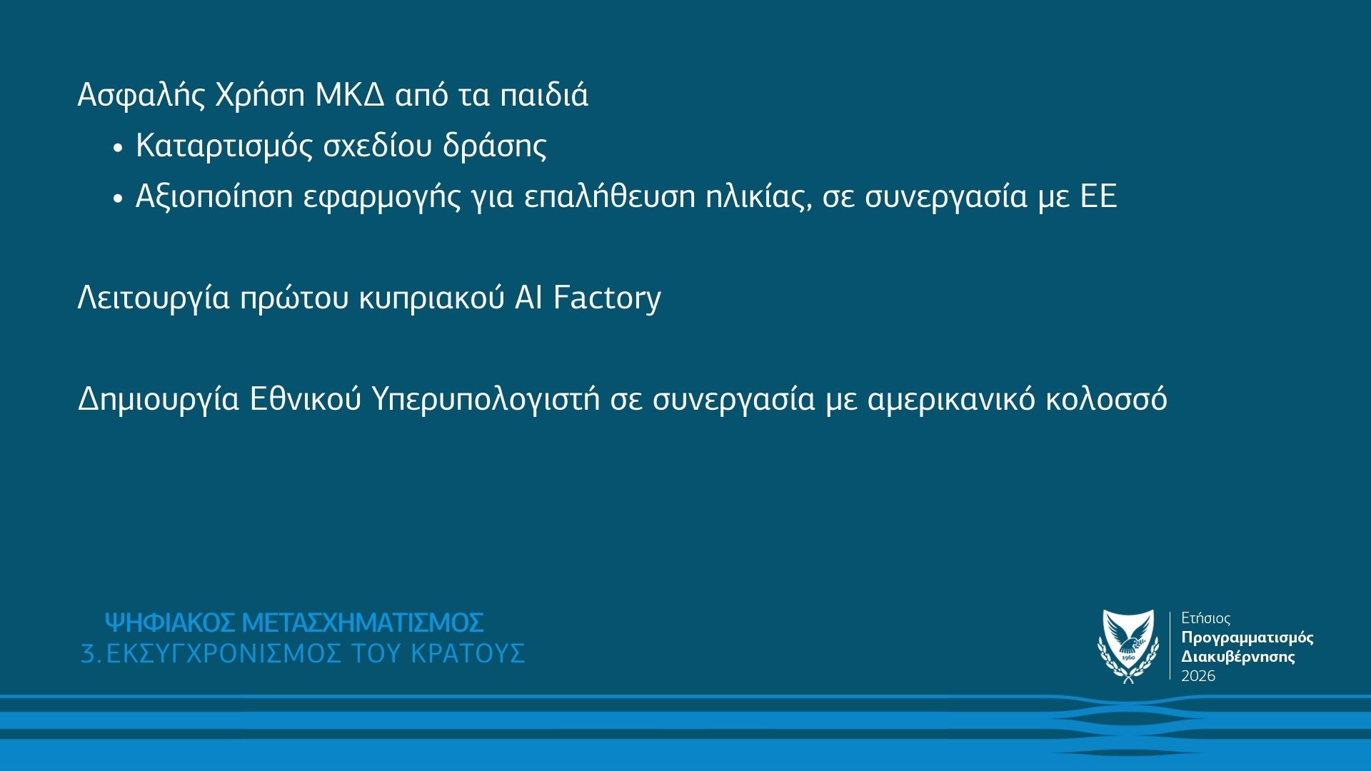 Σε συνέχεια των σημαντικών υπηρεσιών που προσφέρονται ήδη ψηφιακά, το 2026 θα εισαχθούν περισσότερες από 100 νέες ψηφιακές υπηρεσίες, και παράλληλα θα τεθούν σε εφαρμογή νέα πληροφοριακά συστήματα στο Τμήμα Κοινωνικών Ασφαλίσεων, Οδικών Μεταφορών και στην Αστυνομία.