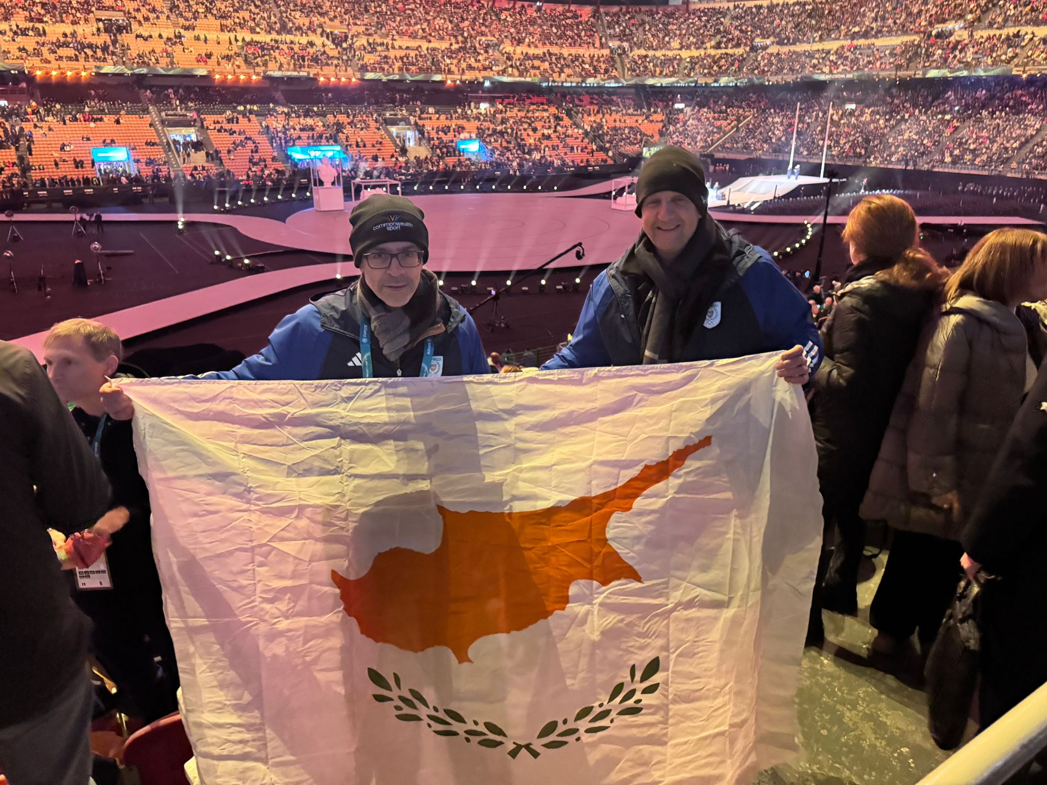Στο επιβλητικό στάδιο «Σαν Σίρο» του Μιλάνου με τη σημαία της χώρας μας βρέθηκαν ο πρόεδρος της Κυπριακής Ολυμπιακής Επιτροπής κ. Γεώργιος Χρυσοστόμου μαζί με τον γενικό γραμματέα κ. Γιώτη Ιωαννίδη.