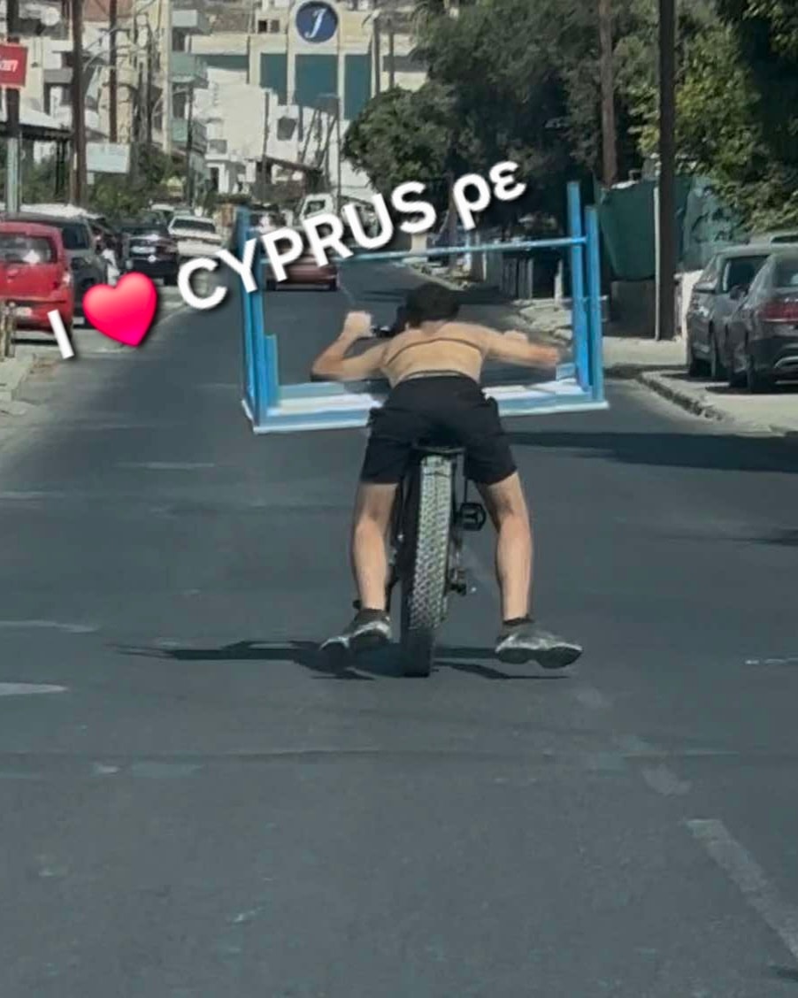 Σε φωτογραφία που δημοσίευσε το I love Cyprus ΡΕ στο facebook φαίνεται άντρας κουβαλάει ολόκληρο τραπέζι σε ποδήλατο και να το κρατάει με τα χέρια του.