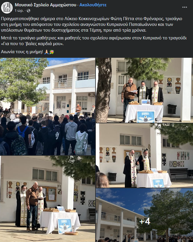 Μαθητές, εκπαιδευτικοί και γονείς συγκεντρώθηκαν στον χώρο του σχολείου για να τιμήσουν τη μνήμη των θυμάτων, σε ένα κλίμα βαθιάς περισυλλογής και σεβασμού. Το τρισάγιο πραγματοποιήθηκε με εμφανή τη συγκίνηση στα πρόσωπα όλων, καθώς ο Κυπριανός υπήρξε ενεργό και αγαπητό μέλος της σχολικής κοινότητας.