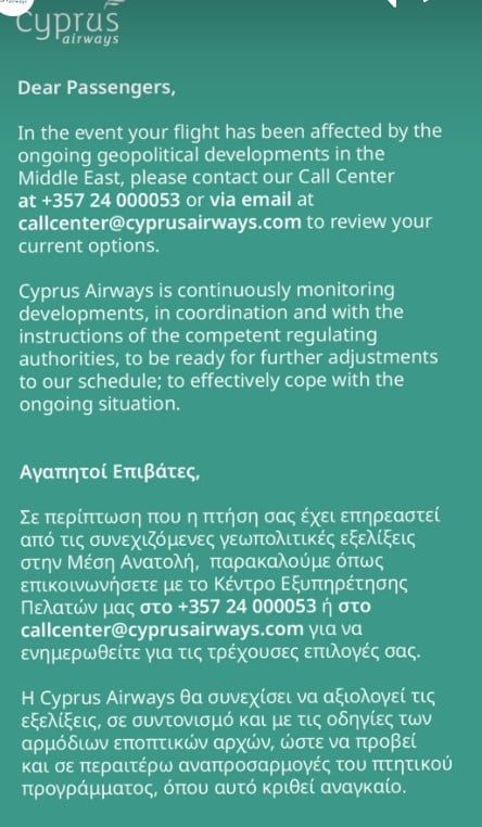 Η Cyprus Airways καλεί τους επιβάτες των οποίων οι πτήσεις έχουν επηρεαστεί να επικοινωνούν με το Κέντρο Εξυπηρέτησης Πελατών, προκειμένου να ενημερωθούν για τις διαθέσιμες επιλογές. Όπως αναφέρει, παρακολουθεί στενά τις εξελίξεις σε συντονισμό με τις αρμόδιες εποπτικές αρχές και δεν αποκλείεται να προχωρήσει σε περαιτέρω αναπροσαρμογές του πτητικού της προγράμματος, εφόσον κριθεί αναγκαίο.