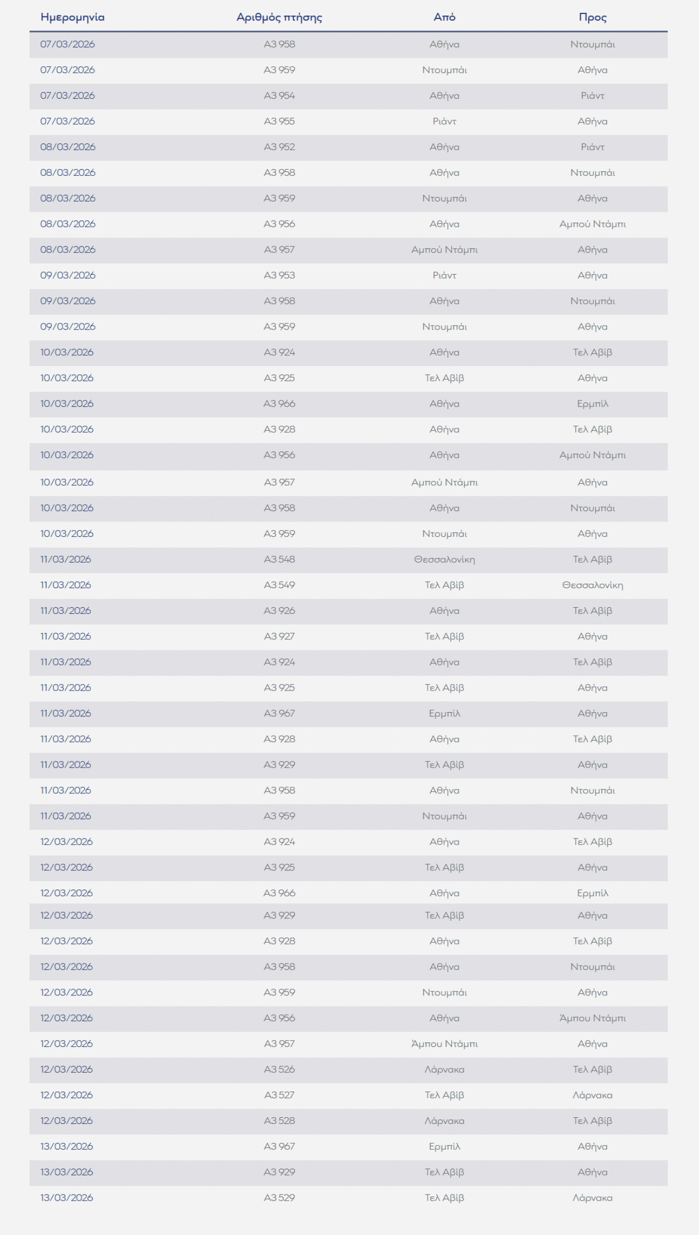 Επιπλέον η αεροπορική εταιρεία ενημερώνει ότι, με στόχο τη διευκόλυνση των επιβατών που διαθέτουν εισιτήρια από και προς το Τελ Αβίβ, το Ερμπίλ, τη Βαγδάτη, τη Βηρυτό, το Αμπού Ντάμπι, το Ντουμπάι και επιπλέον το Ριάντ για πτήσεις με προγραμματισμένη αναχώρηση έως και τις 19 Μαρτίου 2026, παρέχει, εφόσον το επιθυμούν, τη δυνατότητα τροποποίησης των πτήσεων είτε με δωρεάν επανέκδοση και αλλαγή των εισιτηρίων, χωρίς επιπλέον κόστος, για νέα ταξίδια με ημερομηνία αναχώρησης έως και τις 30 Απριλίου 2026, είτε με ακύρωση της κράτησης και έκδοση credit voucher για μελλοντική χρήση.