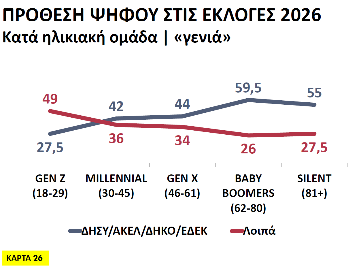 Αντίθετα, στις μεγαλύτερες ηλικίες τα παραδοσιακά κόμματα εξακολουθούν να διατηρούν υψηλότερα επίπεδα στήριξης.