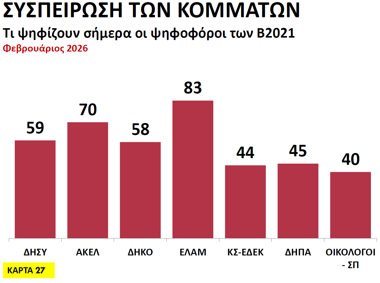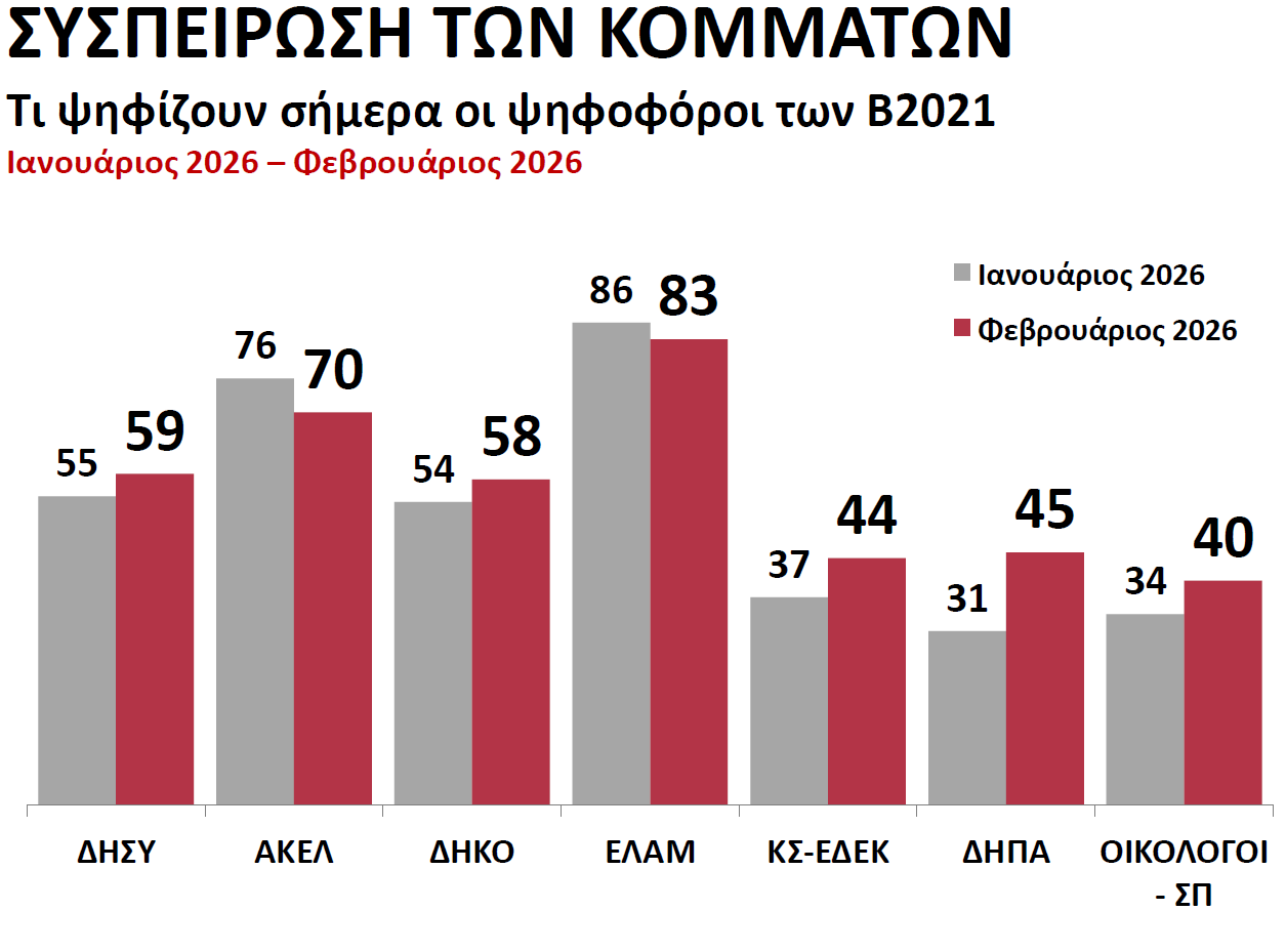 Αντίθετα, χαμηλότερα επίπεδα συσπείρωσης καταγράφονται σε μικρότερα κόμματα, γεγονός που υποδηλώνει μεγαλύτερη κινητικότητα ψηφοφόρων.