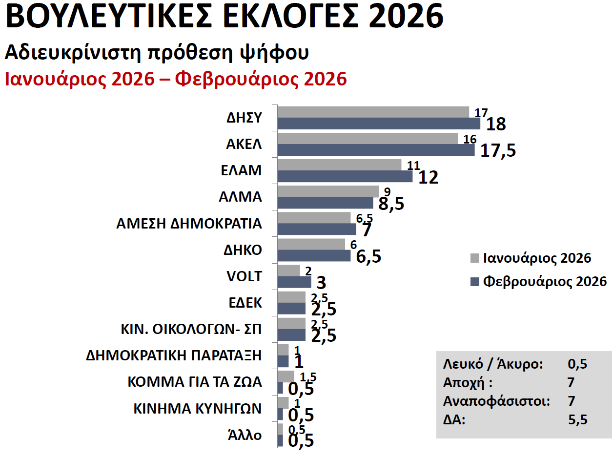Την ίδια ώρα, σημαντικό ποσοστό των ερωτηθέντων παραμένει αναποφάσιστο ή δεν εκφράζει σαφή πρόθεση ψήφου, στοιχείο που αφήνει ανοιχτό το ενδεχόμενο μεταβολών στο πολιτικό σκηνικό μέχρι την ημέρα των εκλογών.