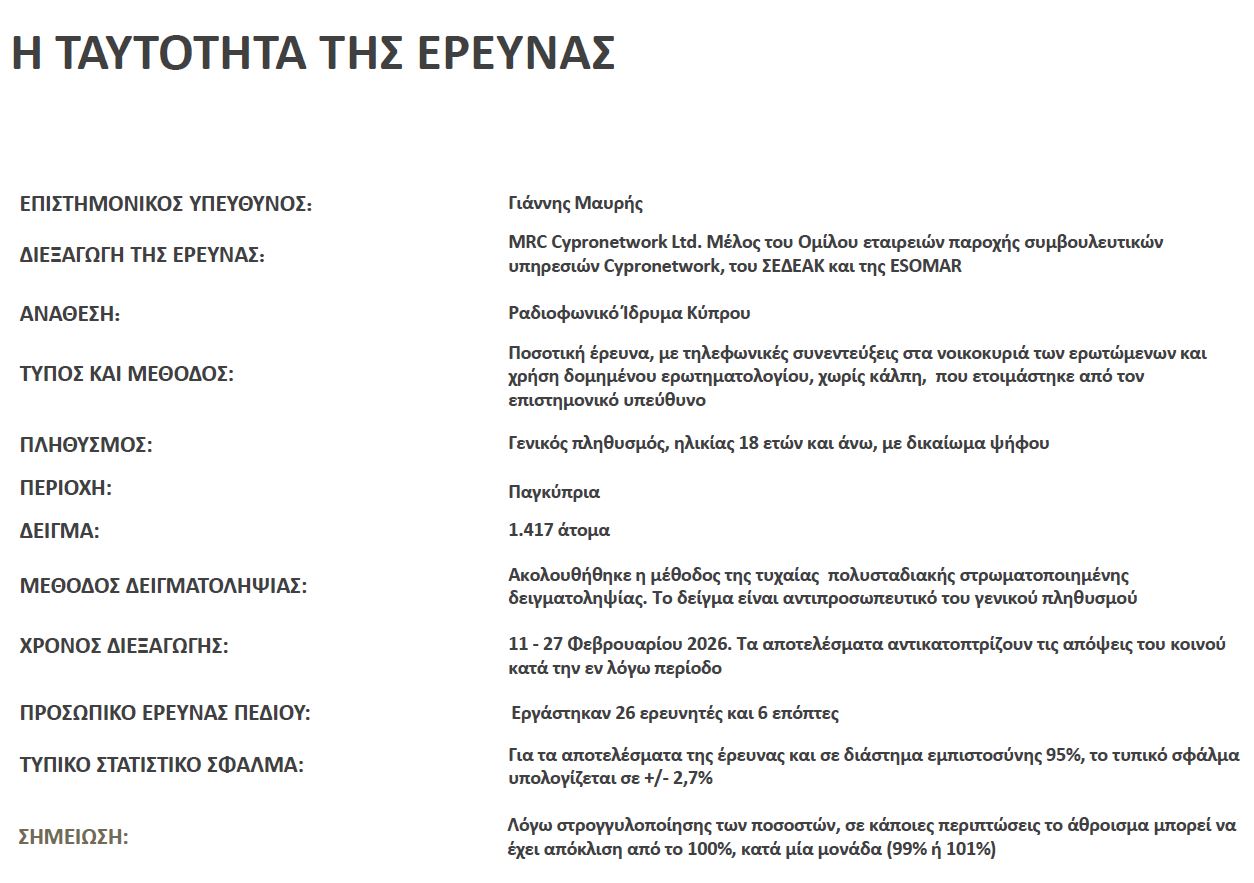 Η δημοσκόπηση αποτελεί μέρος της 41ης Παγκύπριας Έρευνας Πολιτικής Κουλτούρας και Εκλογικής Συμπεριφοράς (ΠΕΠΚΕΣ), ενός μακροχρόνιου θεσμού καταγραφής της κυπριακής κοινής γνώμης που πραγματοποιείται από το 1996.