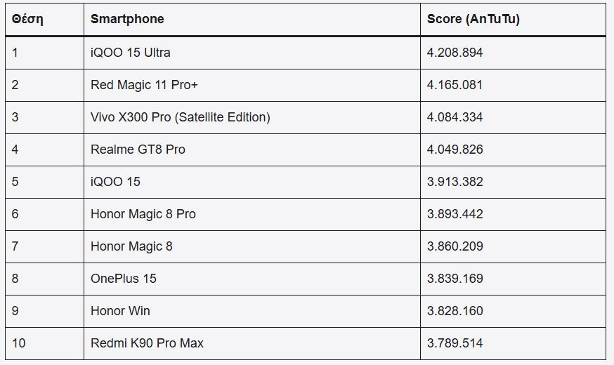 Στην κορυφή βρίσκεται το iQOO 15 Ultra με σκορ πάνω από 4,2 εκατομμύρια πόντους, ενώ ακολουθούν συσκευές από Red Magic, Vivo και Realme.
