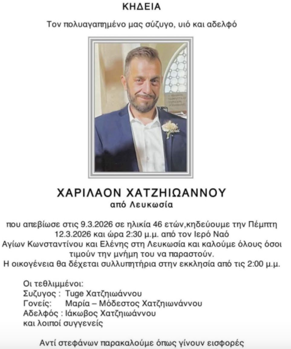Θλίψη σκόρπισε ο χαμός του 46χρονου Χάρη Χατζηιωάννου που απεβίωσε στις 9.3.2026 στη Λευκωσία.